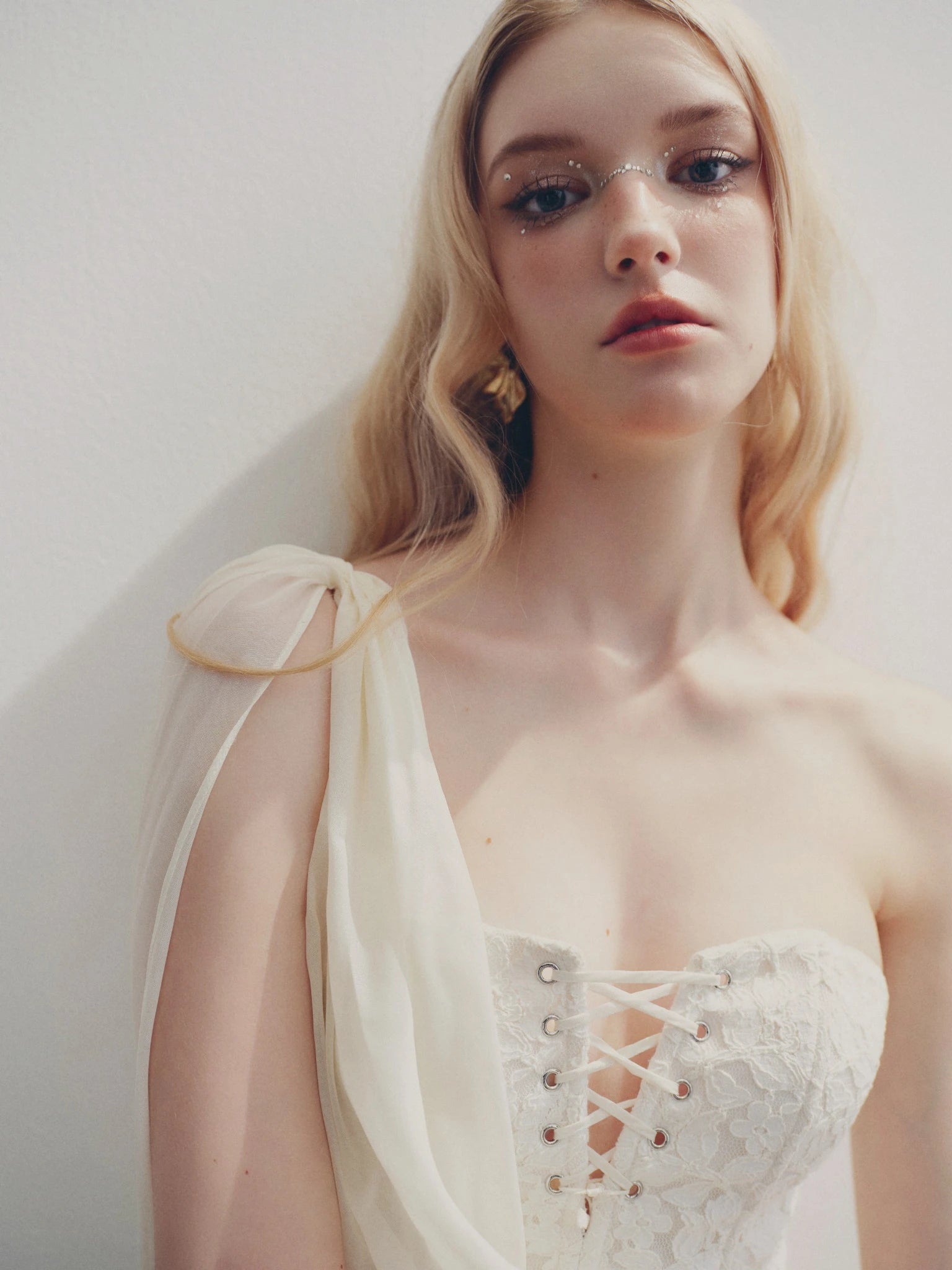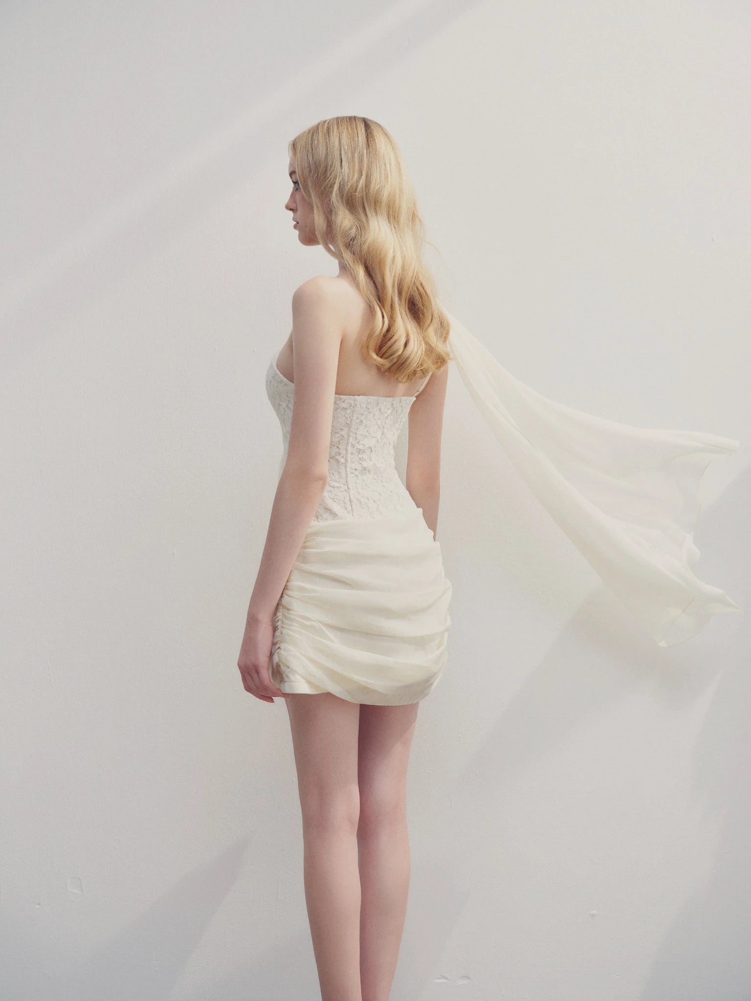 This striking one-shoulder mini dress is a modern take on a classic silhouette. The structured bodice features a unique lace-up corset detail, offering a romantic and edgy contrast to the soft, draped chiffon. The asymmetrical design and artfully ruched skirt create a dynamic and flattering look, making this a truly memorable piece.