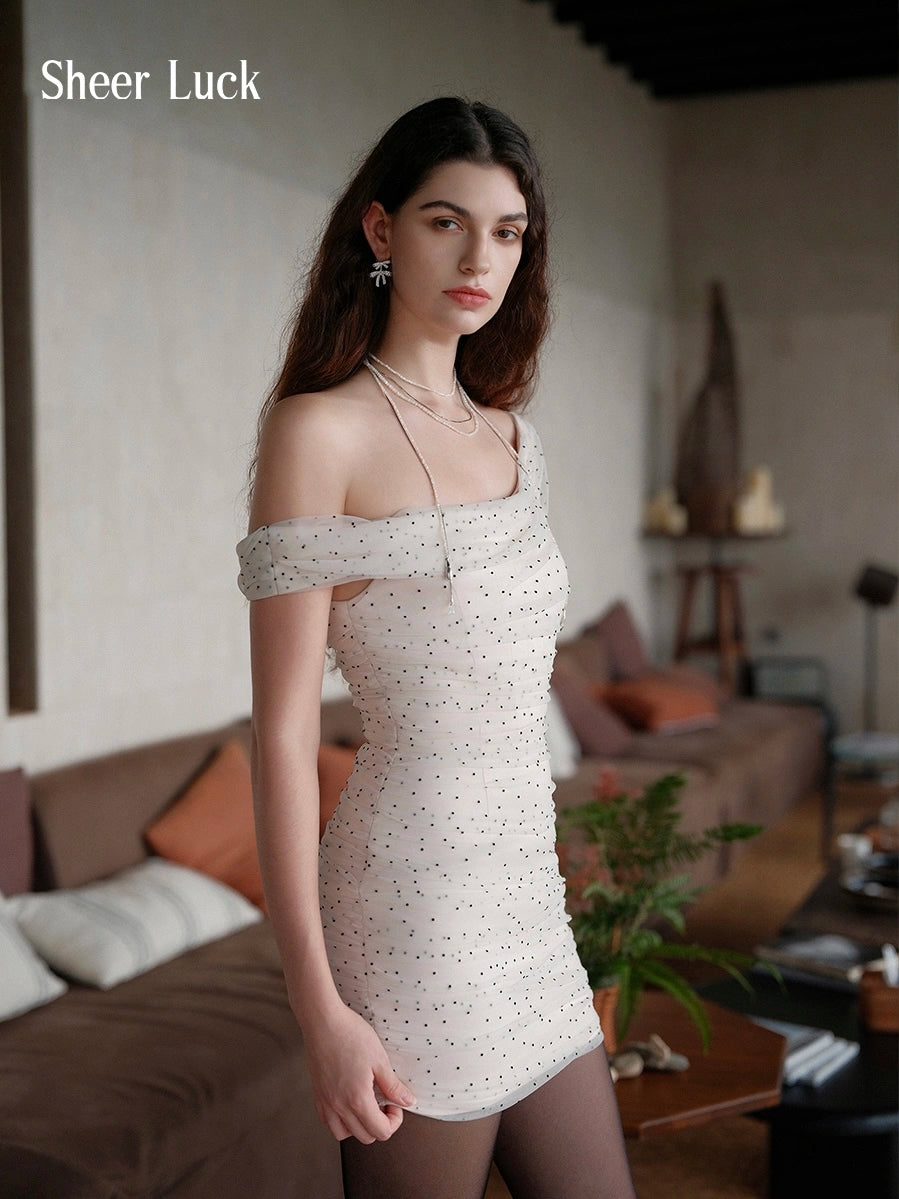 Bindi Satin Polka Dot Mesh One-Shoulder Bodycon Mini Dress