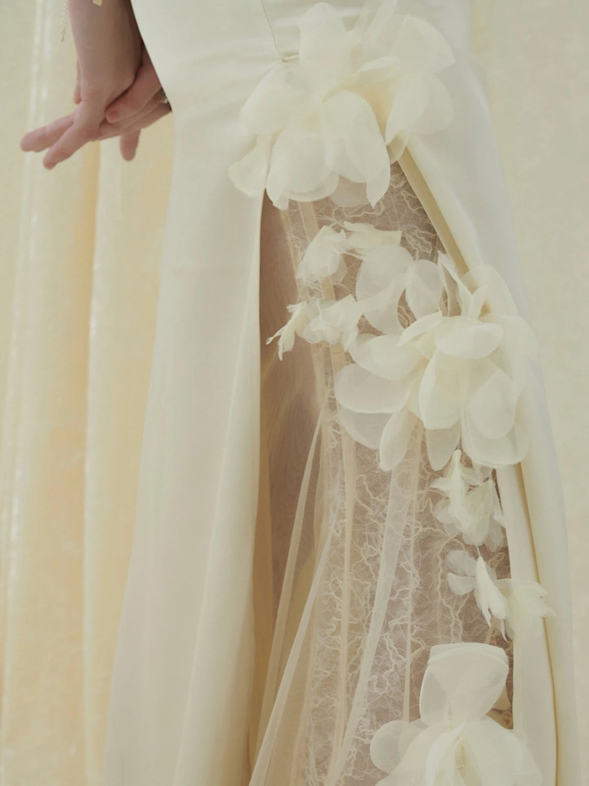Crow Crew V-Neck Bustier Slit Maxi Dress with Mesh Floral Applique - PREORDER