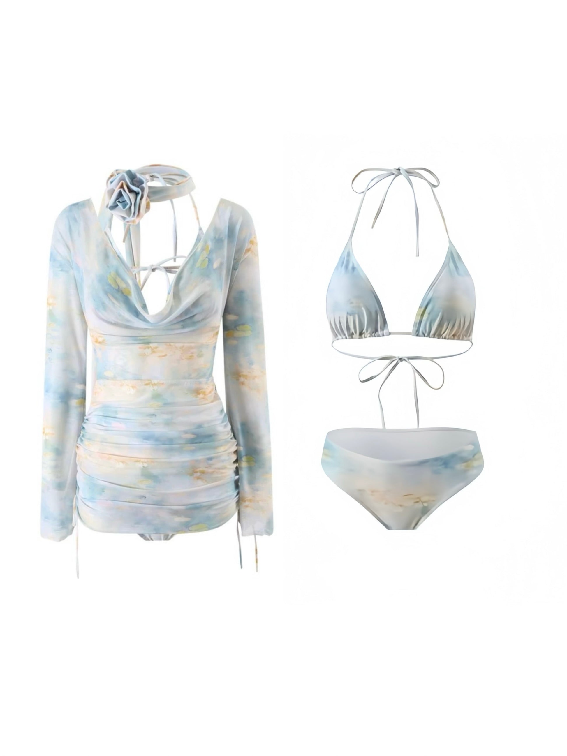 Monet Daydream 4-Piece Bikini Set - Watercolour Pastel Bikini, Cover-Up & Neck Ribbon