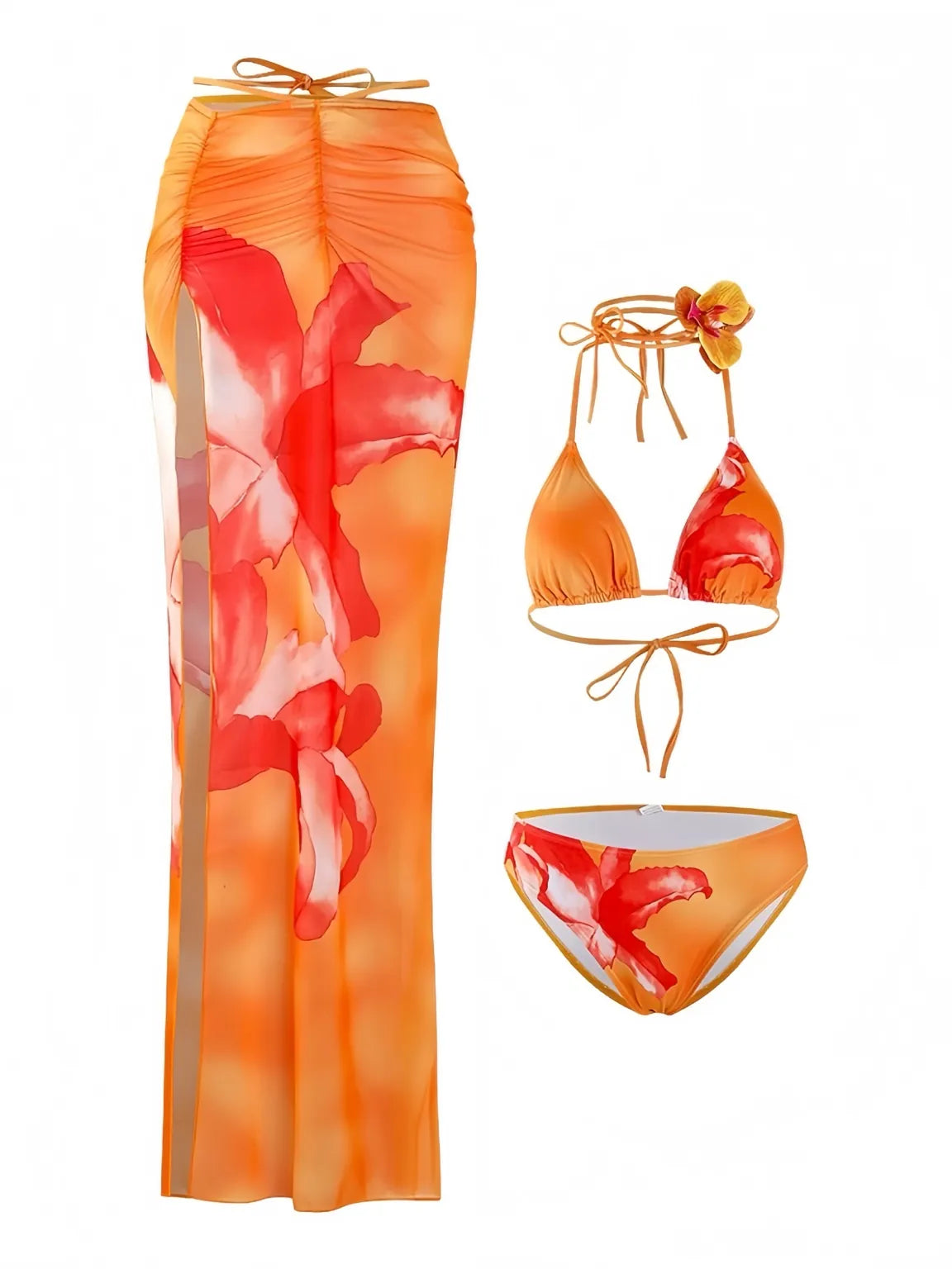 Orange Floral Print Bikini Set with Skirt - 3 Piece Bikini Set