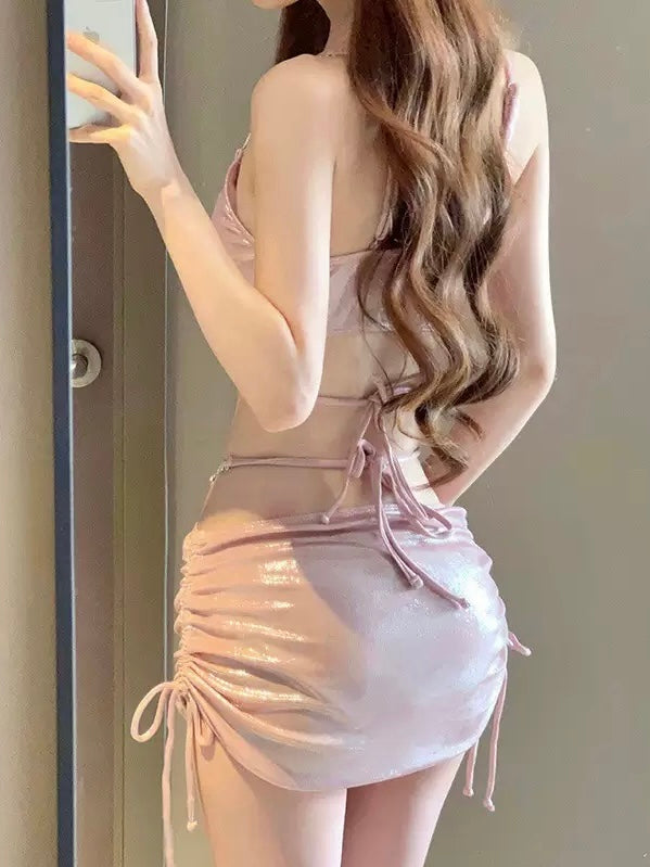 - Three-piece set: bralette bikini top, bikini bottom & mini skirt