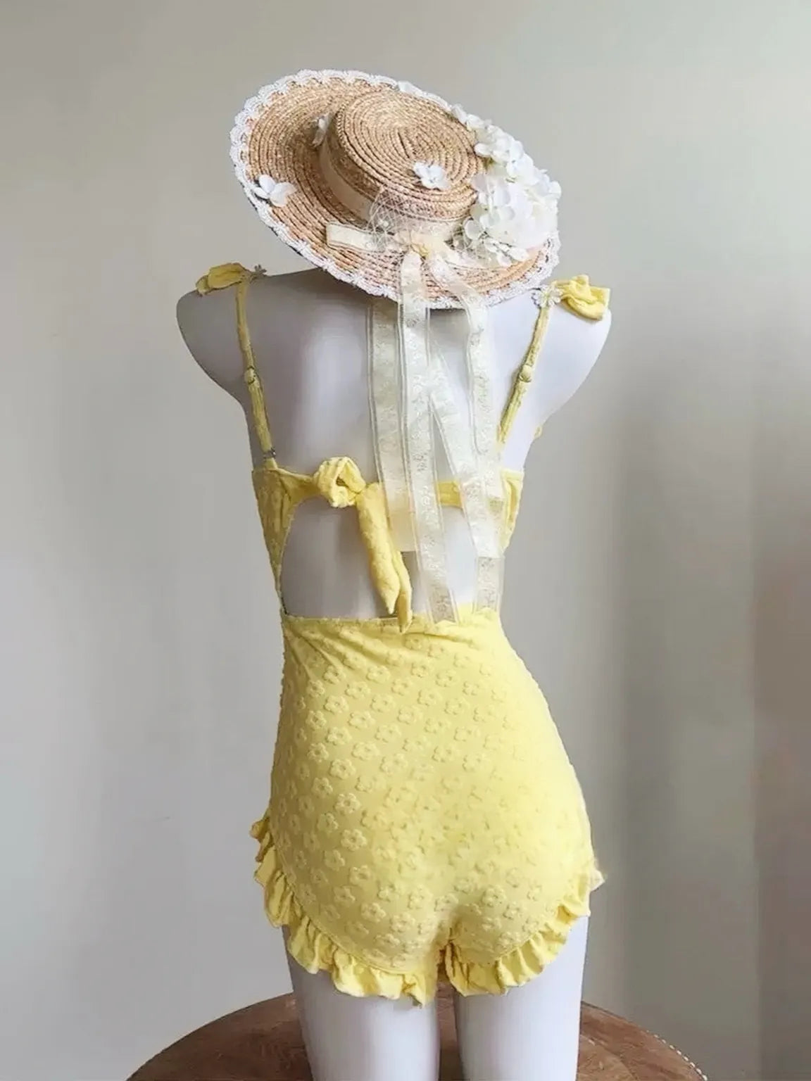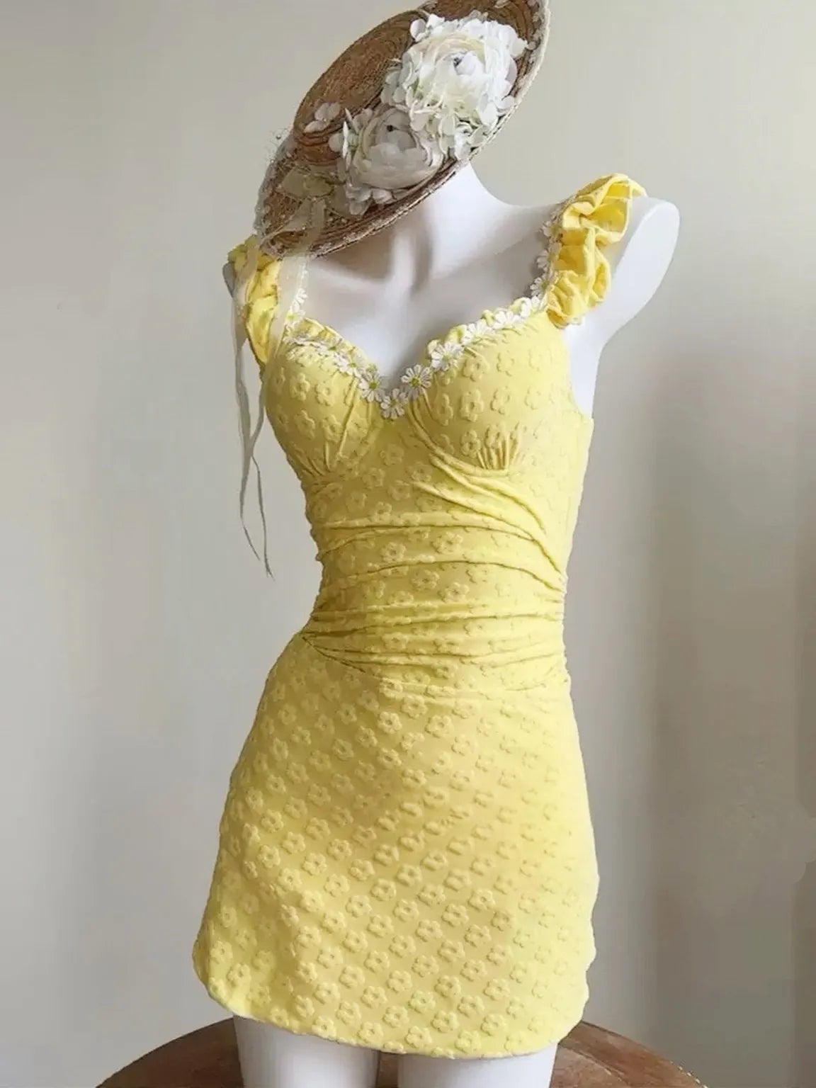 Yellow Daisy Ruffle One-Piece Swimsuit With Wrap Skirt